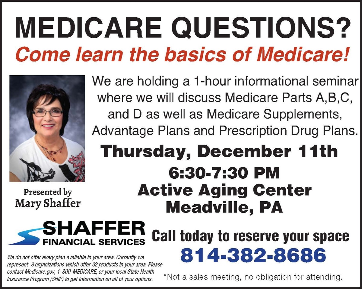 Are you thinking about retirement and wondering how Medicare fits in? Do you have unanswered questions? I’m Mary Shaffer of Shaffer Financial Services and we welcome you to join us on December 11th at Active Aging in Meadville at 6:30pm. We’re having a one-hour informational seminar on Medicare Basics. We’ll discuss Parts A, B, C, and D, as well as Medicare Supplements, Medicare Advantage Plans, and Prescription Drug Plans. There are no sales and no obligation for attending. Call 814-382-8686 to reserve your spot!