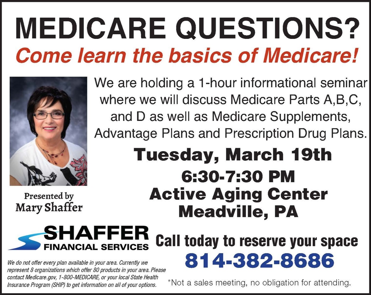 Are you thinking about retirement and wondering how Medicare fits in? Do you have unanswered questions? I’m Mary Shaffer of Shaffer Financial Services and we welcome you to join us on March 19th at Active Aging in Meadville at 6:30pm. We’re having a one-hour informational seminar on Medicare Basics. We’ll discuss Parts A, B, C, and D, as well as Medicare Supplements, Medicare Advantage Plans, and Prescription Drug Plans. There are no sales and no obligation for attending. Call 814-382-8686 to reserve your spot!
